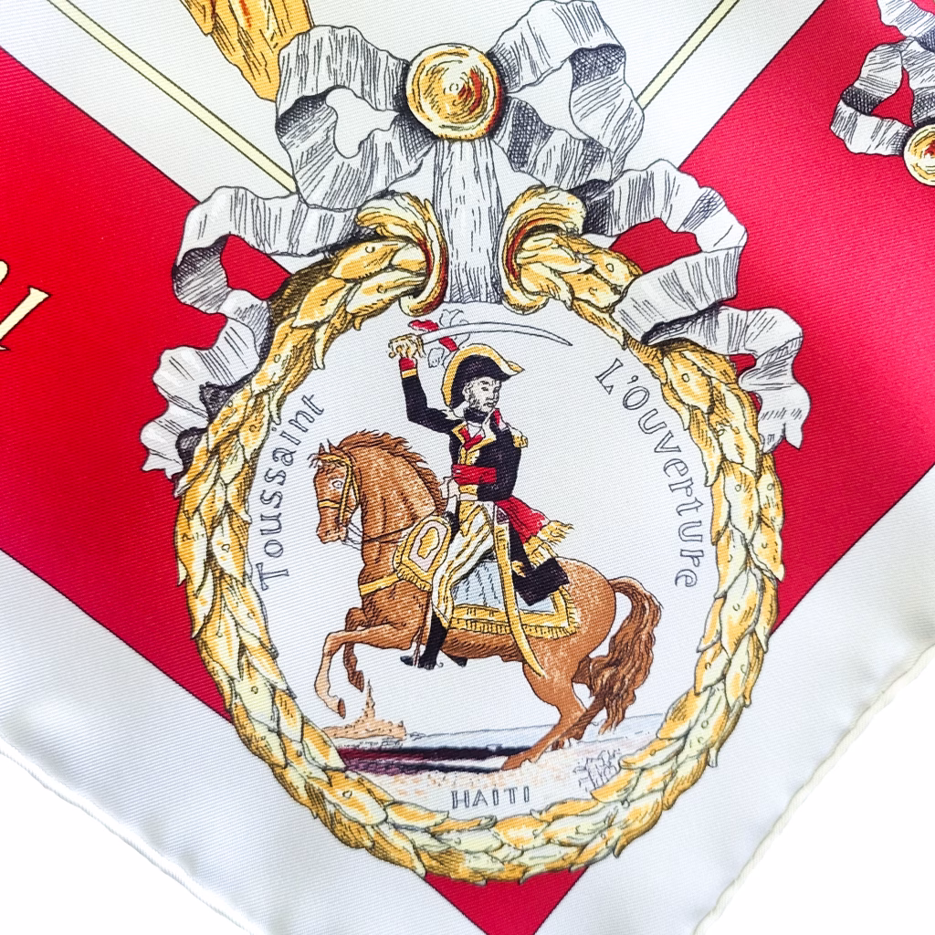 The carré’s red border holds a gallery of historical figures, including Benjamin Franklin, Thomas Jefferson (two bottom corners), and fellow revolutionary, Simon Bolivar, known as the “George Washington of South America”. Toussaint l’Ouverture, a former slave, who led the Haitians in their fight for independence can be found in the corresponding upper corner medallion.